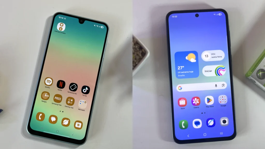 O sistema é igual, o Android 16 com One UI 8. Temos as principais funções nela, como a pasta segura, tela edge com atalhos, recursos de IA nas fotos e mais. Mas o A36 é mais completo, tendo o tela sempre ativa e alguns adicionais. Eles serão atualizados por 6 anos, mas o sistema do A36 é superior.