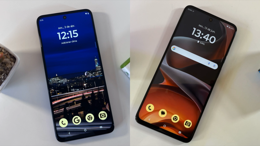 Aqui praticamente não muda nada. Os dois têm tela de 6,7 polegadas com resolução Full HD+ e painel IPS LCD. A qualidade é boa nos dois casos, com cores equilibradas e boa nitidez. Ambos pecam em brilho e ambos ficam limitados aos 60 Hz de taxa de atualização, mas as telas ainda são boas considerando a faixa de preço. No geral, são telas muito parecidas. Empate.