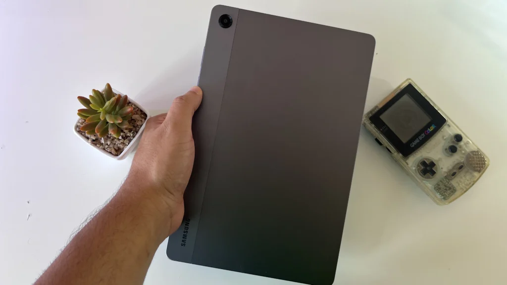 Começando pelo design, o Galaxy Tab A11+ mantém o visual discreto mas bonito e resistente.