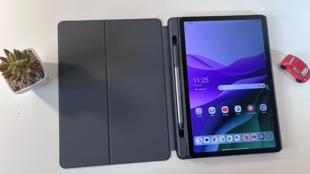 Ele já vem com Android 15, com interface otimizada e vários recursos úteis, como modo PC, que simula um notebook, tela dividida, atalhos com anotações rápidas, recursos de IA pra pesquisa e mais. O software da Lenovo ainda tem menos recursos que os sistemas da Samsung, por exemplo, mas ainda sim é bem completo. Além disso, o tablet vai receber 2 updates de sistema e 4 anos de atualizações de segurança. O software vai atender bem a maioria das pessoas.