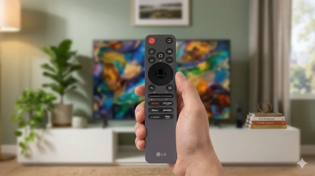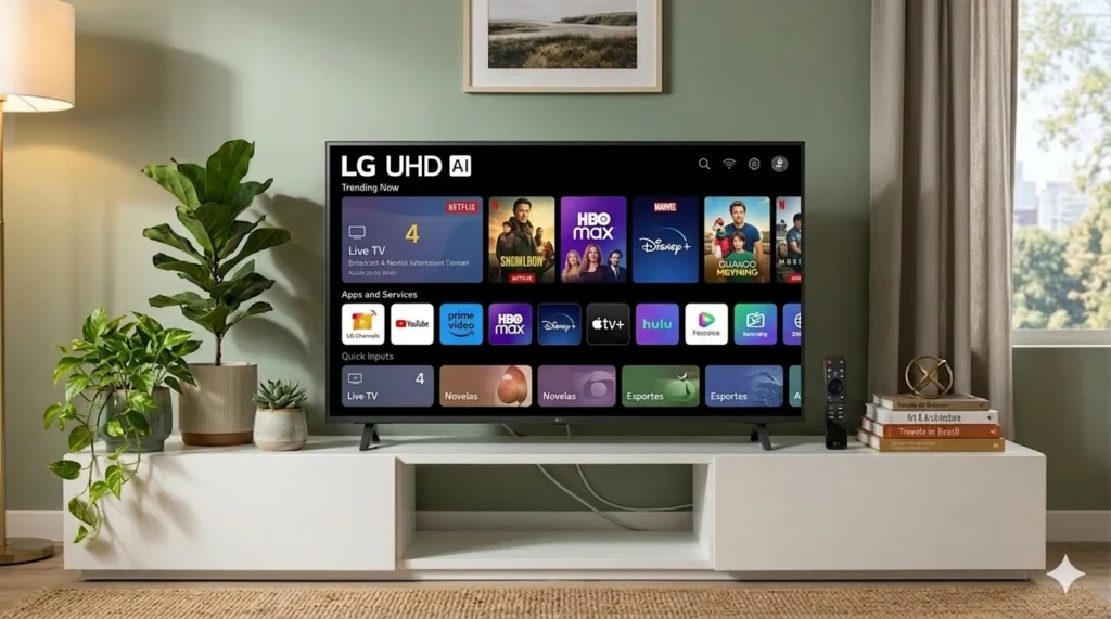 Além disso, esse processador melhora a qualidade de imagem com upscaling, som com inteligência artificial e até a fluidez geral da TV. Ou seja, é uma TV simples, mas com cérebro de modelo mais avançado.
